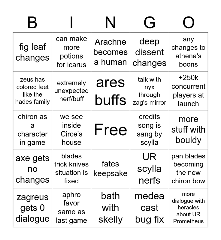 This bingo card has a free space and 24 words: blades trick knives situation is fixed, aphro favor same as last game, ares buffs, zagreus gets 0 dialogue, any changes to athena's boons, fig leaf changes, zeus has colored feet like the hades family, can make more potions for icarus, credits song is sang by scylla, fates keepsake, talk with nyx through zag's mirror, chiron as a character in game, UR scylla nerfs, pan blades becoming the new chiron bow, extremely unexpected nerf/buff, medea cast bug fix, more stuff with bouldy, Arachne becomes a human, +250k concurrent players at launch, we see inside Circe's house, more dialogue with heracles about UR Prometheus, axe gets no changes, deep dissent changes and bath with skelly.