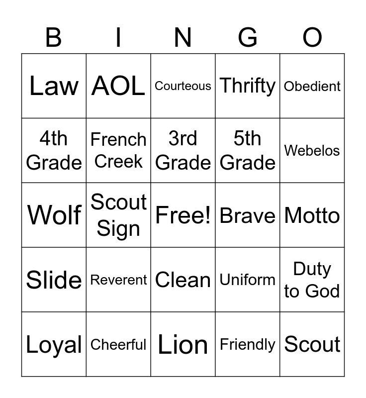 This bingo card has a free space and 44 words: Do your Best, Scout, Trustworthy, Loyal, Helpful, Friendly, Courteous, Kind, Obedient, Cheerful, Thrifty, Brave, Clean, Reverent, Cub, Lion, Tiger, Wolf, Bear, Webelos, AOL, Leader, Bobcat, Law, Oath, Motto, Leave no Trace, Slogan, Uniform, Slide, Neckerchief, Duty to God, Duty to Country, Salute, Scout Sign, Kindergarten, 1st Grade, 2nd Grade, 3rd Grade, 4th Grade, 5th Grade, Pack 52, French Creek and Rivers.