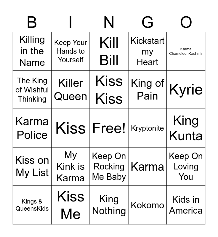 This bingo card has a free space and 32 words: Kokomo, Knockin' on Heaven's Door, Kiss, Kiss from a Rose, Kiss on My List, Killer Queen, Karma ChameleonKashmir, Keep On Loving You, Keep Your Hands to Yourself, Ku Fu Fighting, Kiss Kiss, Kill Bill, Kiss Me Thru The Phone, Knock You Down, Kryptonite, Kiss It Better, Kings & QueensKids, Karma Police, Keep On Rocking Me Baby, My Kink is Karma, Karma, Killing Me Softly With His Song, King Kunta, Kiss Me, Kids in America, Kickstart my Heart, King of Pain, The King of Wishful Thinking, Killing in the Name, King Nothing, Kiss the Girl and Kyrie.