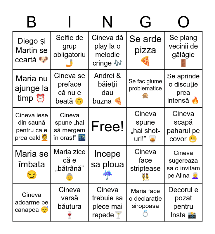 This bingo card has a free space and 24 words: Maria zice că e „bătrână” 👵, Cineva varsă băutura 🍷, Andrei & băieții dau buzna 🍕, Cineva adoarme pe canapea 😴, Se plang vecinii de gălăgie 🚪, Diego și Martin se ceartă 🐶, Maria nu ajunge la timp ⏰, Selfie de grup obligatoriu 🤳, Cineva spune „hai shot-uri!” 🥃, Incepe sa ploua ☔️, Se fac glume problematice 🙊, Cineva iese din saună pentru ca e prea cald💆, Cineva face striptease 👯♀️, Cineva sugereaza sa o invitam pe Alina 👩🦳, Cineva se preface că nu e beată 🙃, Maria face o declarație siropoasa 💍, Cineva scapă paharul pe covor 😬, Cineva dă play la o melodie cringe 🎶, Se aprinde o discuție prea intensă 🔥, Cineva spune „hai să mergem în oraș!” 🌃, Decorul e pozat pentru Insta 📸, Maria se îmbata😏, Se arde pizza 🍕 and Cineva trebuie sa plece mai repede🍸.