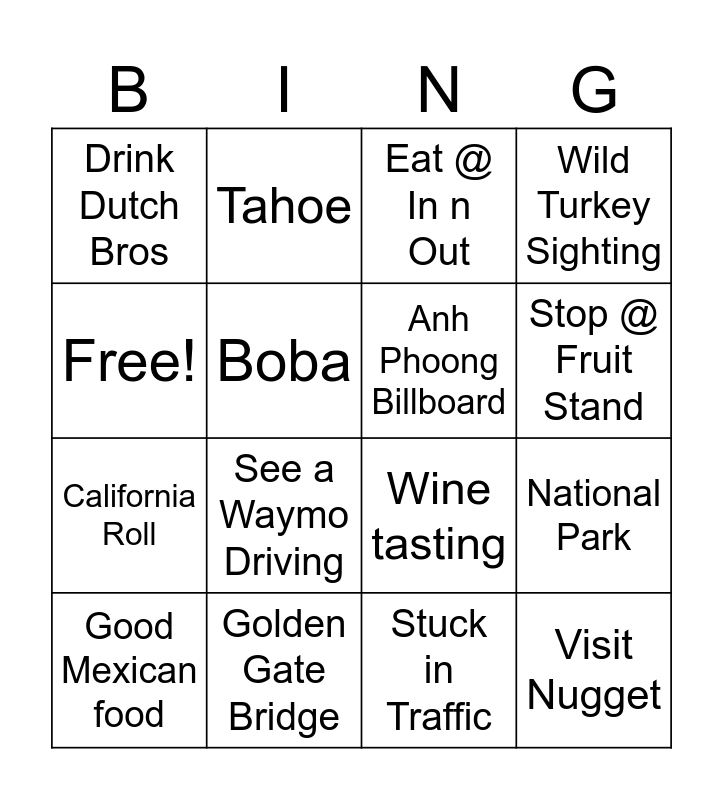 This bingo card has 16 words: Golden Gate Bridge, National Park, Eat @ In n Out, Drink Dutch Bros, California Roll, Tahoe, Wine tasting, Stuck in Traffic, Free!, Boba, Good Mexican food, Wild Turkey Sighting, See a Waymo Driving, Stop @ Fruit Stand, Anh Phoong Billboard and Visit Nugget.