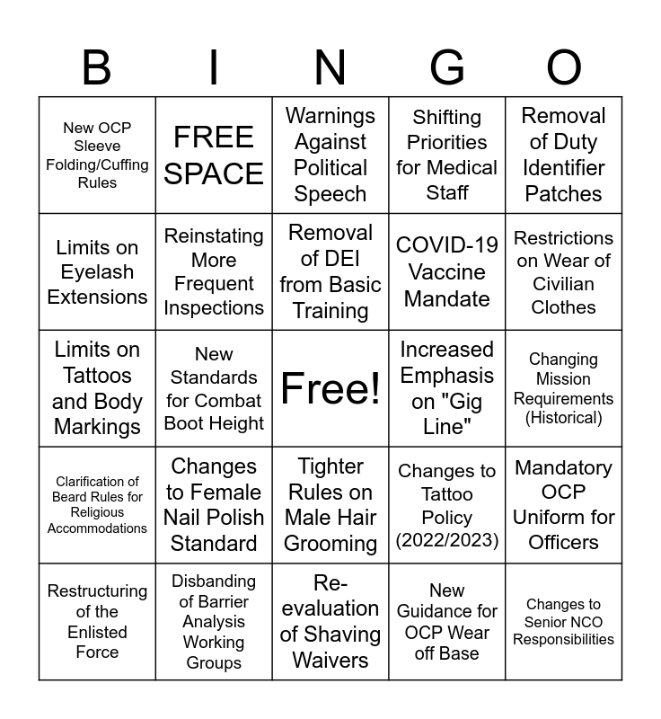 This bingo card has a free space and 25 words: Changes to Female Nail Polish Standard, Re-evaluation of Shaving Waivers, Removal of DEI from Basic Training, Restructuring of the Enlisted Force, Removal of Duty Identifier Patches, New OCP Sleeve Folding/Cuffing Rules, Limits on Eyelash Extensions, FREE SPACE, Increased Emphasis on "Gig Line", Tighter Rules on Male Hair Grooming, COVID-19 Vaccine Mandate, Limits on Tattoos and Body Markings, Changes to Tattoo Policy (2022/2023), Mandatory OCP Uniform for Officers, Reinstating More Frequent Inspections, Changes to Promotion Boards and Skills-Based Promotion, Changing Mission Requirements (Historical), Warnings Against Political Speech, Restrictions on Wear of Civilian Clothes, New Standards for Combat Boot Height, Changes to Senior NCO Responsibilities, Disbanding of Barrier Analysis Working Groups, Clarification of Beard Rules for Religious Accommodations, Shifting Priorities for Medical Staff and New Guidance for OCP Wear off Base.