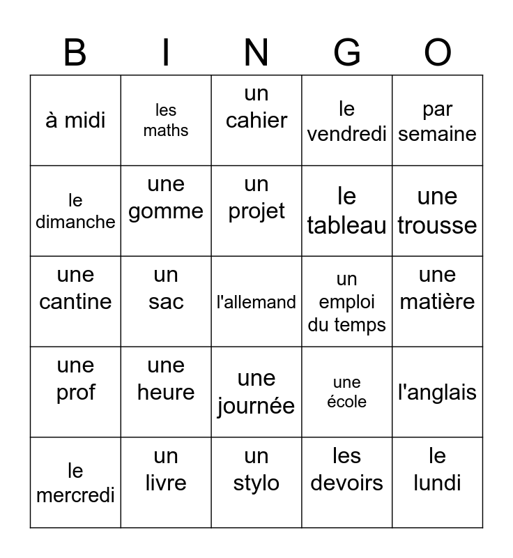 This bingo card has a free space and 24 words: une heure, un livre, un projet, le mercredi, par semaine, à midi, le dimanche, les maths, un emploi du temps, une journée, le tableau, une cantine, une école, l'anglais, une gomme, les devoirs, une matière, un cahier, une trousse, un sac, le lundi, une prof, le vendredi and un stylo.