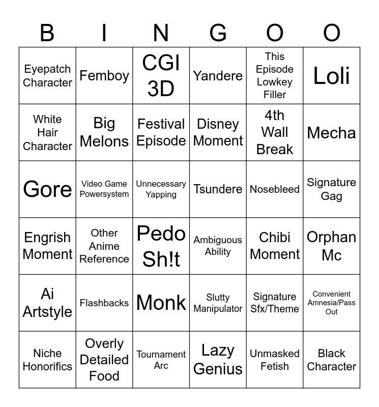 This bingo card has 36 words: Slutty Manipulator, Monk, Lazy Genius, White Hair Character, Engrish Moment, Tsundere, Big Melons, Tournament Arc, This Episode Lowkey Filler, Signature Sfx/Theme, Mecha, Yandere, Convenient Amnesia/Pass Out, Video Game Powersystem, Disney Moment, Eyepatch Character, Ai Artstyle, Nosebleed, Gore, CGI 3D, Unnecessary Yapping, Other Anime Reference, Ambiguous Ability, Pedo Sh!t, Chibi Moment, Femboy, 4th Wall Break, Overly Detailed Food, Festival Episode, Loli, Black Character, Niche Honorifics, Orphan Mc, Signature Gag, Flashbacks and Unmasked Fetish.