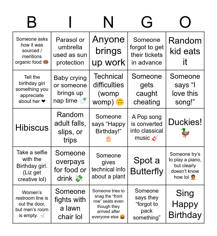 This bingo card has a free space and 24 words: Someone overpays for food or drink 💸, Someone fights with a lawn chair lol, Technical difficulties (womp womp) 🙃, Women’s restroom line is out the door, but men’s room is empty. 🚽, Random kid eats it, Someone asks how it was sourced / mentions organic food 🍩, Tell the birthday girl something you appreciate about her ❤, Parasol or umbrella used as sun protection, A Pop song is converted into classical music 🎸, Someone gives technical info about a plant, Someone gets caught cheating, Hibiscus, Spot a Butterfly, Someone try’s to play a piano, but clearly doesn’t know how lol 🤦🏽, Baby crying or someone brings up nap time 🍼, Someone says they “forgot to pack something”, Duckies! 🦆, Anyone brings up work, Someone says “I love this song!”, Random adult falls, slips, or trips, Sing Happy Birthday, Take a selfie with the Birthday girl. (Liz get creative lol), Someone forgot to get their tickets in advance and Someone tries to snag the “front row” seats even though they arrived after everyone else 🤬.