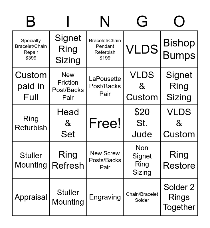 This bingo card has a free space and 24 words: Ring Refresh, Stuller Mounting, LaPousette Post/Backs Pair, Appraisal, Bishop Bumps, Specialty Bracelet/Chain Repair $399, Custom paid in Full, Signet Ring Sizing, $20 St. Jude, New Screw Posts/Backs Pair, VLDS & Custom, Ring Refurbish, Non Signet Ring Sizing, Ring Restore, New Friction Post/Backs Pair, Chain/Bracelet Solder, VLDS & Custom, Bracelet/Chain Pendant Referbish $199, Signet Ring Sizing, Head & Set, Solder 2 Rings Together, Stuller Mounting, VLDS and Engraving.