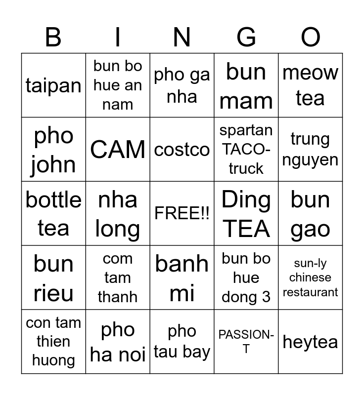 This bingo card has a free space and 24 words: com tam thanh, pho ha noi, costco, con tam thien huong, meow tea, taipan, pho john, bun bo hue an nam, Ding TEA, banh mi, spartan TACO- truck, bottle tea, bun bo hue dong 3, sun-ly chinese restaurant, CAM, PASSION- T, bun gao, pho ga nha, trung nguyen, nha long, heytea, bun rieu, bun mam and pho tau bay.
