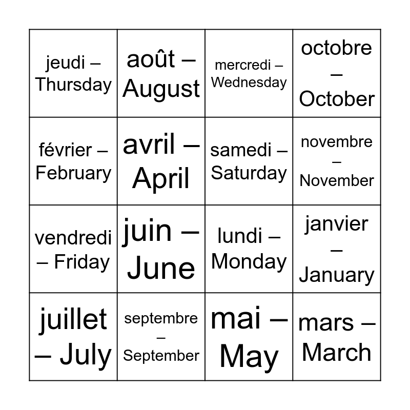 This bingo card has 19 words: lundi – Monday, mardi – Tuesday, mercredi – Wednesday, mars – March, janvier – January, février – February, mai – May, jeudi – Thursday, août – August, vendredi – Friday, juin – June, avril – April, samedi – Saturday, septembre – September, juillet – July, dimanche – Sunday, octobre – October, novembre – November and décembre – December.