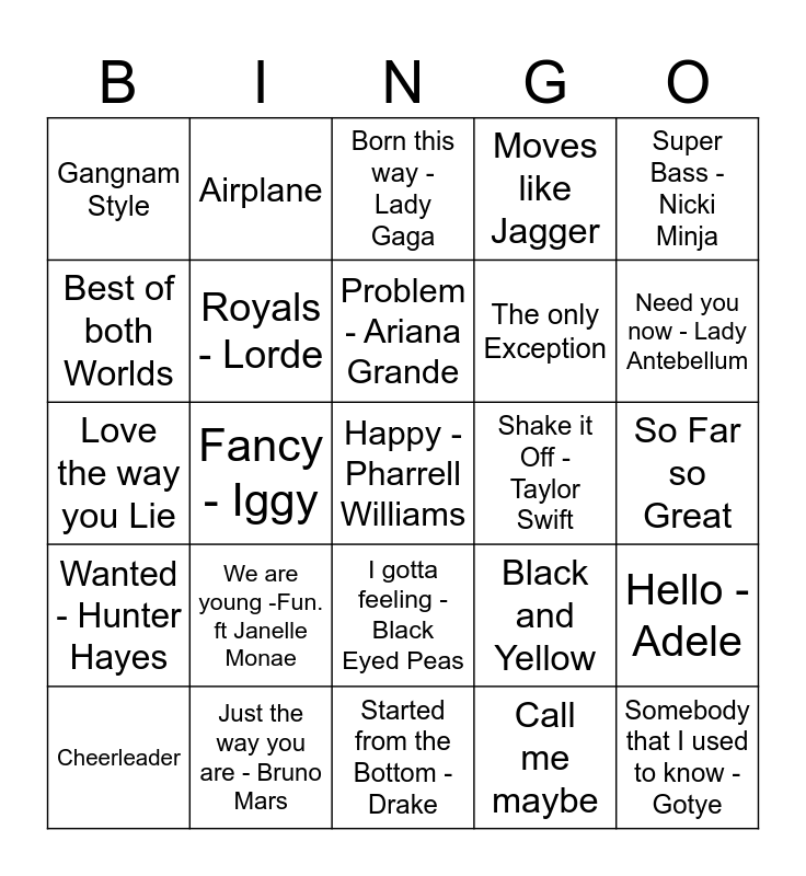 This bingo card has a free space and 29 words: Tik Tok - Kesha, Just the way you are - Bruno Mars, Born this way - Lady Gaga, Party Rock Anthem, Super Bass - Nicki Minja, Gangnam Style, Royals - Lorde, Problem - Ariana Grande, Shake it Off - Taylor Swift, Hello - Adele, Cheerleader, Fancy - Iggy, Call me maybe, Somebody that I used to know - Gotye, Love the way you Lie, Umbrella - Rihanna, Started from the Bottom - Drake, Black and Yellow, Need you now - Lady Antebellum, Wanted - Hunter Hayes, We are young -Fun. ft Janelle Monae, Pumped up Kicks, The only Exception, So Far so Great, Best of both Worlds, Airplane, I gotta feeling - Black Eyed Peas, Moves like Jagger and Wild Ones.