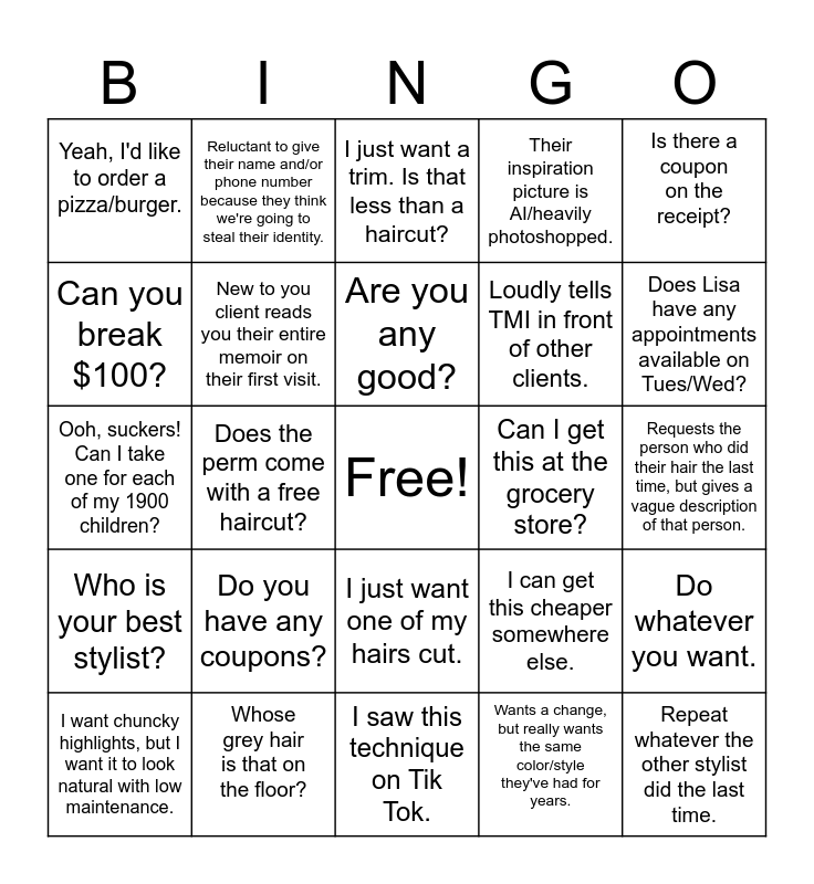 This bingo card has a free space and 29 words: I want chuncky highlights, but I want it to look natural with low maintenance., Before finishing the haircut they ask you if you're going to blend it., Does the perm come with a free haircut?, I want just one layer., Yeah, I'd like to order a pizza/burger., I just want a trim. Is that less than a haircut?, New to you client reads you their entire memoir on their first visit., Do you have any coupons?, Can I get this at the grocery store?, Whose grey hair is that on the floor?, Requests the person who did their hair the last time, but gives a vague description of that person., Repeat whatever the other stylist did the last time., I saw this technique on Tik Tok., Wants a change, but really wants the same color/style they've had for years., Does Lisa have any appointments available on Tues/Wed?, Says they were a "toe head" as a child., I just want one of my hairs cut., Who is your best stylist?, Is there a coupon on the receipt?, Ooh, suckers! Can I take one for each of my 1900 children?, I can get this cheaper somewhere else., I just had my grey hairs touched up 6 weeks ago and it faded at my roots., Loudly tells TMI in front of other clients., Can you break $100?, Their inspiration picture is AI/heavily photoshopped., Reluctant to give their name and/or phone number because they think we're going to steal their identity., Do whatever you want., Are you any good? and My old hairdresser only charged.....