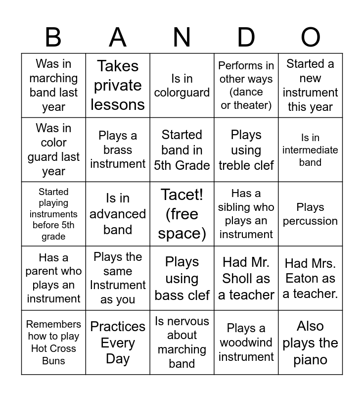 This bingo card has a free space and 24 words: Plays the same Instrument as you, Practices Every Day, Started band in 5th Grade, Remembers how to play Hot Cross Buns, Started a new instrument this year, Was in marching band last year, Was in color guard last year, Takes private lessons, Has a sibling who plays an instrument, Plays using bass clef, Plays using treble clef, Started playing instruments before 5th grade, Had Mr. Sholl as a teacher, Had Mrs. Eaton as a teacher., Plays a brass instrument, Plays a woodwind instrument, Plays percussion, Is in colorguard, Is in intermediate band, Is in advanced band, Also plays the piano, Has a parent who plays an instrument, Performs in other ways (dance or theater) and Is nervous about marching band.