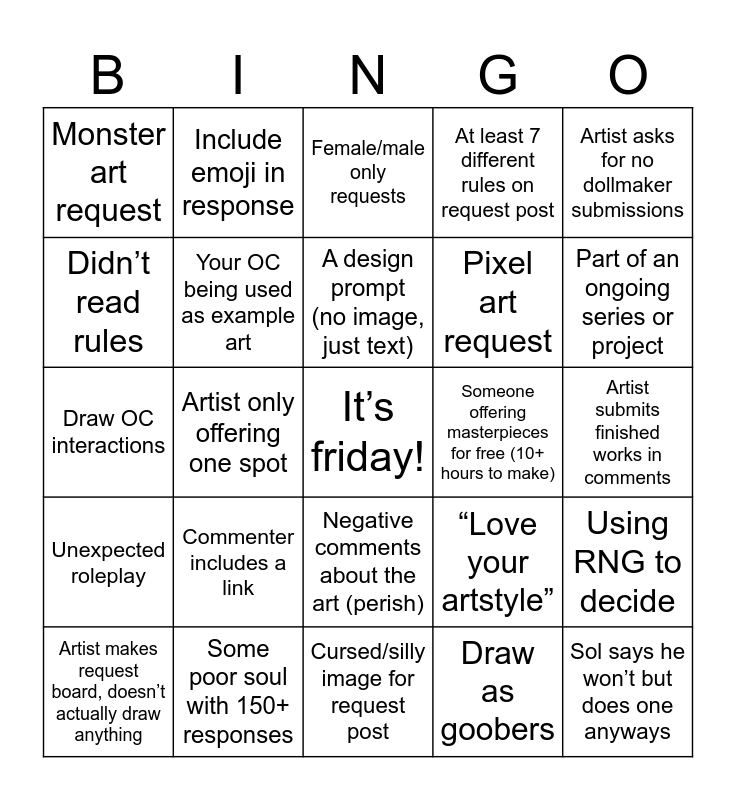 This bingo card has a free space and 24 words: Commenter includes a link, Some poor soul with 150+ responses, A design prompt (no image, just text), Artist makes request board, doesn’t actually draw anything, Artist asks for no dollmaker submissions, Monster art request, Didn’t read rules, Include emoji in response, Someone offering masterpieces for free (10+ hours to make), Negative comments about the art (perish), Pixel art request, Draw OC interactions, “Love your artstyle”, Using RNG to decide, Your OC being used as example art, Draw as goobers, Artist submits finished works in comments, Female/male only requests, Part of an ongoing series or project, Artist only offering one spot, Sol says he won’t but does one anyways, Unexpected roleplay, At least 7 different rules on request post and Cursed/silly image for request post.