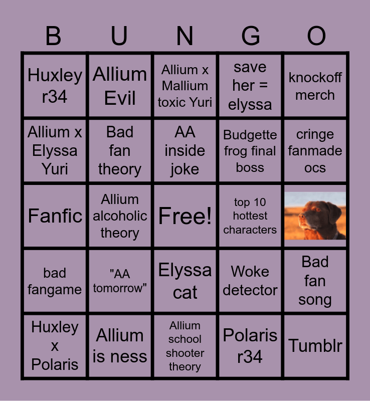 This bingo card has 1 images, a free space and 23 words: "AA tomorrow", Allium is ness, AA inside joke, Huxley x Polaris, knockoff merch, Huxley r34, Allium x Elyssa Yuri, Allium Evil, top 10 hottest characters, Elyssa cat, Budgette frog final boss, Fanfic, Woke detector, Bad fan song, Bad fan theory, Polaris r34, Allium x Mallium toxic Yuri, cringe fanmade ocs, Allium alcoholic theory, Tumblr, bad fangame, save her = elyssa and Allium school shooter theory.