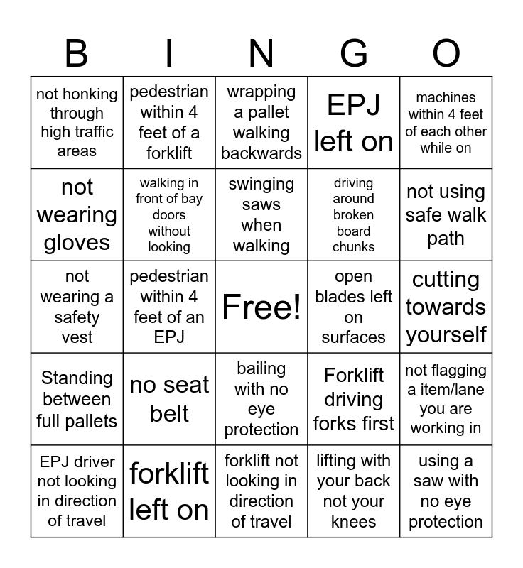 This bingo card has a free space and 24 words: no seat belt, forklift left on, swinging saws when walking, EPJ driver not looking in direction of travel, machines within 4 feet of each other while on, not honking through high traffic areas, not wearing gloves, pedestrian within 4 feet of a forklift, open blades left on surfaces, bailing with no eye protection, driving around broken board chunks, not wearing a safety vest, Forklift driving forks first, not flagging a item/lane you are working in, walking in front of bay doors without looking, lifting with your back not your knees, cutting towards yourself, wrapping a pallet walking backwards, not using safe walk path, pedestrian within 4 feet of an EPJ, using a saw with no eye protection, Standing between full pallets, EPJ left on and forklift not looking in direction of travel.