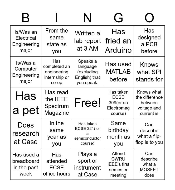 This bingo card has a free space and 25 words: In the same year as you, Plays a sport or instrument at Case, Speaks a language (excluding English) that you speak., Has used a breadboard in the past week, Has designed a PCB before, Is/Was an Electrical Engineering major, Is/Was a Computer Engineering major, From the same state as you, Has taken ECSE 309(or an Electromag course), Has taken ECSE 321( or a semiconductor course), Has used MATLAB before, Has a pet, Same birthday month as you, Can describe what a flip-flop is to you, Has completed an engineering internship or co-op, Can name all parts of an op-amp, Knows what the difference between voltage and current is, Written a lab report at 3 AM, Knows what SPI stands for, Has read the IEEE Spectrum Magazine, Can describe what a MOSFET does, Has attended ECSE office hours, Does research at Case, Has fried an Arduino and Attend CWRU IEEE’s first semester meeting.