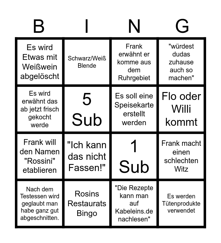 This bingo card has 25 words: Es wird erwähnt, er komme aus Dorsten, Seine Sterne werden erwähnt, Flo oder Willi kommt, 1 Sub, Es wird erwähnt das ab jetzt frisch gekocht werde, Es wird Etwas mit Weißwein abgelöscht, 5 Sub, Schwarz/Weiß Blende, Rosins Restaurats Bingo, Frank Braucht mal 5 Minuten, Frank will den Namen "Rossini" etablieren, 1 Sub, Es weint jemand, Rosin wird touchy, Es soll eine Speisekarte erstellt werden, Die Inhaber sind verschuldet, "Die Rezepte kann man auf Kabeleins.de nachlesen", Frank erwähnt er komme aus dem Ruhrgebiet, "Ich kann das nicht Fassen!", Frank macht einen schlechten Witz, Nach dem Testessen wird geglaubt man habe ganz gut abgeschnitten., Die Wände werden grau gestrichen, Es werden Tütenprodukte verwendet, "würdest dudas zuhause auch so machen" and "ein Testesser sagt das Fleisch sei trocken.