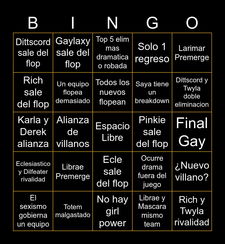 This bingo card has a free space and 24 words: Librae Premerge, Totem malgastado, Todos los nuevos flopean, El sexismo gobierna un equipo, Larimar Premerge, Dittscord sale del flop, Rich sale del flop, Gaylaxy sale del flop, Pinkie sale del flop, Ecle sale del flop, Saya tiene un breakdown, Karla y Derek alianza, Ocurre drama fuera del juego, ¿Nuevo villano?, Un equipo flopea demasiado, Librae y Mascara mismo team, Final Gay, Top 5 elim mas dramatica o robada, Dittscord y Twyla doble eliminacion, Alianza de villanos, Rich y Twyla rivalidad, Eclesiastico y Dilfeater rivalidad, Solo 1 regreso and No hay girl power.