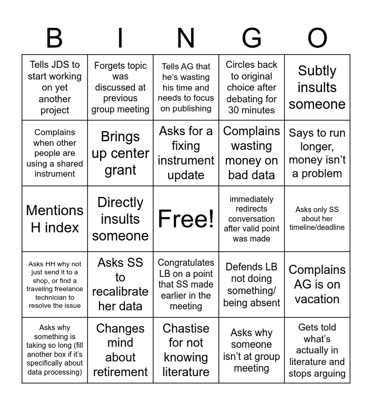 This bingo card has a free space and 27 words: Defends LB not doing something/ being absent, Says to get the dean involved /he’ll get involved with a 2 by 4 to knock some sense, Complains wasting money on bad data, Chastise for not knowing literature, Complains when other people are using a shared instrument, Tells AG that he’s wasting his time and needs to focus on publishing, Forgets topic was discussed at previous group meeting, Asks HH why not just send it to a shop, or find a traveling freelance technician to resolve the issue, immediately redirects conversation after valid point was made, Complains AG is on vacation, Mentions H index, Circles back to original choice after debating for 30 minutes, Asks why something is taking so long (fill another box if it’s specifically about data processing), Changes mind about retirement, Says to run longer, money isn’t a problem, Gets mad and makes assumptions about data, Brings up center grant, Asks for a fixing instrument update, Asks SS to recalibrate her data, Tells JDS to start working on yet another project, Asks only SS about her timeline/deadline, Asks why someone isn’t at group meeting, Directly insults someone, Gets told what’s actually in literature and stops arguing, Congratulates LB on a point that SS made earlier in the meeting, Subtly insults someone and “They don’t know what they’re talking about”.