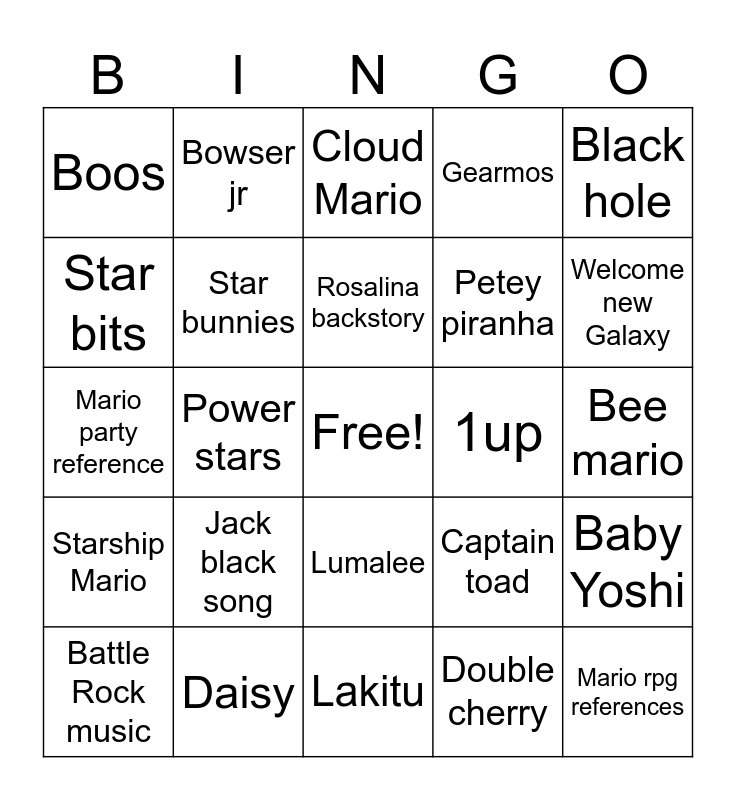This bingo card has a free space and 24 words: Jack black song, Daisy, Rosalina backstory, Battle Rock music, Black hole, Boos, Star bits, Bowser jr, 1up, Lumalee, Petey piranha, Mario party reference, Captain toad, Baby Yoshi, Star bunnies, Double cherry, Bee mario, Cloud Mario, Welcome new Galaxy, Power stars, Mario rpg references, Starship Mario, Gearmos and Lakitu.