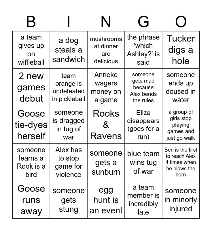 This bingo card has a free space and 24 words: Alex has to stop game for violence, someone gets stung, Anneke wagers money on a game, Goose runs away, Tucker digs a hole, a team gives up on wiffleball, 2 new games debut, a dog steals a sandwich, Eliza disappears (goes for a run), someone gets a sunburn, someone gets mad because Alex bends the rules, Goose tie-dyes herself, blue team wins tug of war, Ben is the first to reach Alex 4 times when he blows the horn, team orange is undefeated in pickleball, a team member is incredibly late, a group of girls stop playing games and just go walk, mushrooms at dinner are delicious, someone ends up doused in water, someone is dragged in tug of war, someone in minorly injured, someone learns a Rook is a bird, the phrase 'which Ashley?' is said and egg hunt is an event.