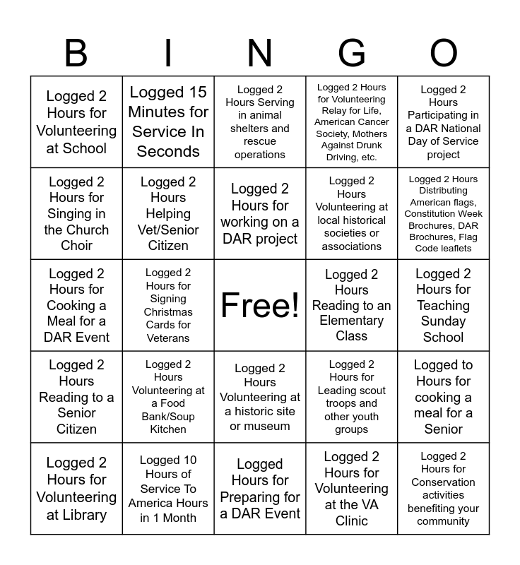 This bingo card has a free space and 29 words: Logged 2 Hours for Volunteering at Library, Logged 15 Hours of Service To America Hours in 1 Month, Logged 2 Hours for Signing Christmas Cards for Veterans, Logged 2 Hours Assisting with before and after school activities, Logged 2 Hours for Volunteering at School, Logged 2 Hours Serving in animal shelters and rescue operations, Logged 2 Hours Helping Vet/Senior Citizen, Logged 2 Hours Volunteering at a Food Bank/Soup Kitchen, Logged 2 Hours Reading to an Elementary Class, Logged 10 Hours of Service To America Hours in 1 Month, Logged 2 Hours for Teaching Sunday School, Logged 2 Hours for Conservation activities benefiting your community, Logged Hours for Preparing for a DAR Event, Logged 2 Hours for Volunteering at the VA Clinic, Logged 2 Hours Distributing American flags, Constitution Week Brochures, DAR Brochures, Flag Code leaflets, Logged 2 Hours Cleaning or documenting a headstone, Logged 2 Hours Volunteering at a historic site or museum, Logged 2 Hours Reading to a Senior Citizen, Logged 2 Hours Participating in a DAR National Day of Service project, Logged 2 Hours for Cooking a Meal for a DAR Event, Logged 2 Hours for Leading scout troops and other youth groups, Logged 2 Hours for Shopping for a Volunteer Event, Logged 2 Hours Volunteering at local historical societies or associations, Logged 2 Hours for Singing in the Church Choir, Logged 2 Hours for Volunteering Relay for Life, American Cancer Society, Mothers Against Drunk Driving, etc., Logged 15 Minutes for Service In Seconds, Logged to Hours for cooking a meal for a Senior, Logged 2 Hours for working on a DAR project and Logged 2 Hours for Writing thank-you cards to veterans or active-duty military.