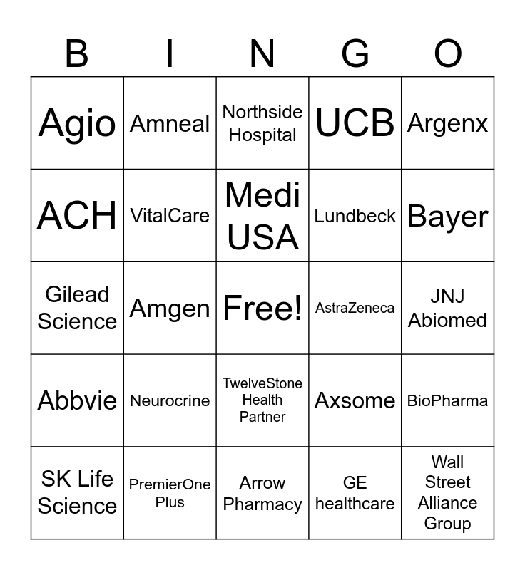 This bingo card has a free space and 33 words: TG Therapeutics, Vanda Pharmaceuticals, Amgen, GSK, Abbvie, VitalCare, Argenx, SK Life Science, Amneal, Gilead Science, Medi USA, Northside Hospital, Sanofi, Acadia, AstraZeneca, Bayer, PremierOne Plus, Gilead Science, Neurocrine, Axsome, TwelveStone Health Partner, Rigel, Agio, JNJ Abiomed, Arrow Pharmacy, Wall Street Alliance Group, UCB, Lundbeck, ACH, BioPharma, Kowa Pharma, GE healthcare and Ortho Atlanta.