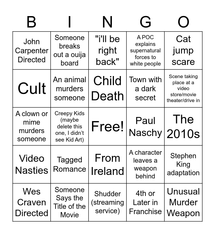 This bingo card has a free space and 77 words: black person dies first, Cops ignore/don’t believe the danger, "i'll be right back", car won't start, The ending teases a sequel, A harbinger of doom warns the protagonist, creepy kid art, library scene, Killer’s backstory exposition dump, Nudity, Dog Death, Cat Death, Child Death, Cult, Bad Scientific Explanation, Creepy Kids (maybe delete this one, I didn’t see Kid Art), Final girl, Unusual Murder Weapon, Haunted Technology, Cat jump scare, “Based on a True Story”, A clown or mime murders someone, An animal murders someone, Someone breaks out a ouija board, A POC explains supernatural forces to white people, A lovecraftian type story with no exposition just mysterious (I don’t know how to describe it), Sudden change in weather, Someone investigates a strange noise, An escape room type situation with torture, Toxic Waste/Ooze/Sludge/Slime, A character watches a horror movie, A himbo ignoring warning signs, Exorcisms/ Christian horror stuff (first omen as an example), A character leaves a weapon behind, Scene taking place at a video store/movie theater/drive in, Town with a dark secret, Fake rubber bat, Prior to 1950s, The 2010s, 4th or Later in Franchise, From Japan, From Australia, From South Korea, From Italy, From France, From South America, Wes Craven Directed, John Carpenter Directed, Roger Corman (Director or Producer), Directed by a Woman, Directed by a Person of Color, From Ireland, From Indonesia, From Hong Kong, From George A. Romero, From Clive Barker, Chrisopher Lee or Vincent Price, Universal Monsters, Featuring an ‘80s Scream Queen, Slasher, Tagged Romance, Tagged Comedy, Blumhouse, From Sam Raimi, Tagged Sci-fi, From Amicus or Hammer Studios, Tagged Drama, Paul Naschy, Found footage, Tagged Music, Queer filmmaker, Stephen King adaptation, Video Nasties, Someone Says the Title of the Movie, Silent Film, Shudder (streaming service) and Tubi (streaming service).