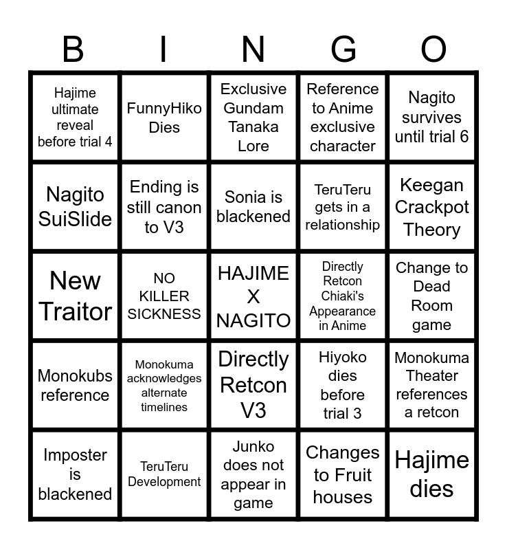 This bingo card has a free space and 24 words: Monokuma acknowledges alternate timelines, TeruTeru Development, Sonia is blackened, Imposter is blackened, Nagito survives until trial 6, Hajime ultimate reveal before trial 4, Nagito SuiSlide, FunnyHiko Dies, Directly Retcon Chiaki's Appearance in Anime, Directly Retcon V3, TeruTeru gets in a relationship, New Traitor, Hiyoko dies before trial 3, Monokuma Theater references a retcon, Ending is still canon to V3, Changes to Fruit houses, Change to Dead Room game, Exclusive Gundam Tanaka Lore, Keegan Crackpot Theory, NO KILLER SICKNESS, Hajime dies, Monokubs reference, Reference to Anime exclusive character and Junko does not appear in game.