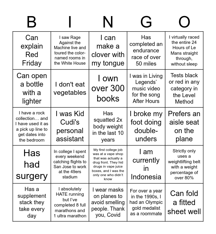 This bingo card has 25 words: In college I spent every weekend catching flights to San Jose to work at the 49ers stadium, I wear masks on planes to avoid smelling people. Thank you, Covid, I own over 300 books, Has a supplement stack they take every day, I virtually raced the entire 24 Hours of Le Mans straight through, without sleep, Can explain Red Friday, Can open a bottle with a lighter, I saw Rage Against the Machine live and toured the color-named rooms in the White House, I broke my foot doing double-unders, My first college job was at a vape shop that was actually a drug front. They hid drugs in vape juice boxes, and I was the only one who didn’t know, I was in Living Legends’ music video for the song After Hours, I have a rock collection… and I have used it as a pick up line to get dates into the bedroom, I am currently in Indonesia, Strictly only uses a weightlifting belt with a weight percentage of over 80%, I don't eat vegetables, Can fold a fitted sheet well, Prefers an aisle seat on the plane, I can make a clover with my tongue, Tests black or red in any category in the Level Method, I was Kid Cudi's personal assistant, Has squatted 2x body weight in the last 10 years, I absolutely HATE running but I’ve completed 8 full marathons and 1 ultra marathon, Has had surgery, Has completed an endurance race of over 50 miles and For over a year in the 1990s, I had an Olympic gold medalist as a roommate.