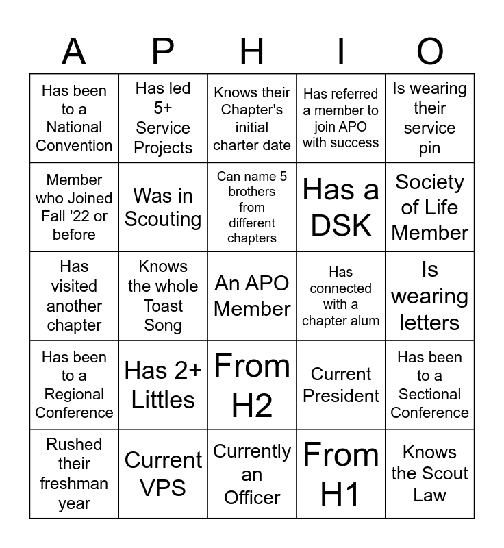 This bingo card has a free space and 24 words: Has 2+ Littles, Current VPS, Can name 5 brothers from different chapters, Rushed their freshman year, Is wearing their service pin, Has been to a National Convention, Member who Joined Fall '22 or before, Has led 5+ Service Projects, Has connected with a chapter alum, From H2, Has a DSK, Has visited another chapter, Current President, Has been to a Sectional Conference, Was in Scouting, From H1, Is wearing letters, Knows their Chapter's initial charter date, Society of Life Member, Knows the whole Toast Song, Knows the Scout Law, Has been to a Regional Conference, Has referred a member to join APO with success and Currently an Officer.