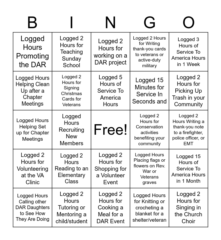 This bingo card has a free space and 29 words: Logged Hours Calling other DAR Daughters to See How They Are Doing, Logged Hours for Preparing for a DAR Event, Logged Hours Recruiting New Members, Logged 2 Hours Assisting with before and after school activities, Logged Hours Promoting the DAR, Logged 2 Hours for working on a DAR project, Logged 2 Hours for Signing Christmas Cards for Veterans, Logged 2 Hours Reading to an Elementary Class, Logged 2 Hours for Conservation activities benefiting your community, Logged 2 Hours Tutoring or Mentoring a child/student, Logged 2 Hours Writing a thank-you note to a firefighter, police officer, or EMT, Logged 2 Hours for Singing in the Church Choir, Logged 2 Hours for Cooking a Meal for a DAR Event, Logged Hours for Knitting or crocheting a blanket for a shelter/veteran, Logged 2 Hours for Picking Up Trash in your Community, Logged 2 Hours Participating in a DAR National Day of Service project, Logged 2 Hours for Shopping for a Volunteer Event, Logged 2 Hours for Volunteering at the VA Clinic, Logged 3 Hours of Service To America Hours in 1 Week, Logged Hours Helping Set up for Chapter Meetings, Logged Hours Placing flags or flowers on Rev. War or Veterans graves, Logged Hours for Participate in a genealogy workshop or help someone trace ancestry, Logged 15 Minutes for Service In Seconds and, Logged Hours Helping Clean Up after a Chapter Meetings, Logged 2 Hours for Writing thank-you cards to veterans or active-duty military, Logged 2 Hours for Teaching Sunday School, Logged 15 Hours of Service To America Hours in 1 Month, Logged 5 Hours of Service To America Hours and Logged 15 Minutes for Service In Seconds.