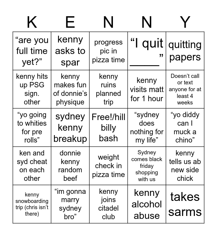 This bingo card has a free space and 24 words: donnie kenny random beef, “im gonna marry sydney bro”, kenny ruins planned trip, kenny snowboarding trip (chris isn’t there), quitting papers, “are you full time yet?”, kenny hits up PSG sign. other, kenny asks to spar, “sydney does nothing for my life”, weight check in pizza time, kenny visits matt for 1 hour, “yo going to whities for pre rolls”, Sydney comes black friday shopping with us, kenny tells us ab new side chick, kenny makes fun of donnie’s physique, kenny alcohol abuse, “yo diddy can I muck a chino”, progress pic in pizza time, Doesn’t call or text anyone for at least 4 weeks, sydney kenny breakup, takes sarms, ken and syd cheat on each other, “I quit ____” and kenny joins citadel club.