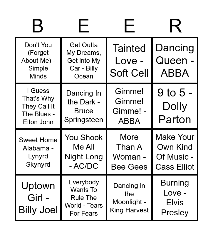 This bingo card has 61 words: The Loco-Motion - Grand Funk Railroad, Signed, Sealed, Delivered - Stevie Wonder, Rivers of Babylon - Boney M., Burning Love - Elvis Presley, Rich Girl - Daryl Hall & John Oates, Rock the Boat - Hues Corporation, Gimme! Gimme! Gimme! - ABBA, Go Your Own Way - Fleetwood Mac, Sweet Home Alabama - Lynyrd Skynyrd, Le Freak - CHIC, Dancing Queen - ABBA, Heart Of Glass - Blondie, Dancing In the Dark - Bruce Springsteen, Fast Car - Tracy Chapman, Material Girl - Madonna, Don't You (Forget About Me) - Simple Minds, Uptown Girl - Billy Joel, I Guess That's Why They Call It The Blues - Elton John, Come On Eileen - Dexys Midnight Runners, 9 to 5 - Dolly Parton, Everybody Wants To Rule The World - Tears For Fears, Tainted Love - Soft Cell, Don't Stop Believin' - Journey, Call Me - Blondie, Radio Ga Ga - Queen, Wake Me Up Before You Go-Go - Wham!, We Built This City - Starship, Footloose - Kenny Loggins, You Shook Me All Night Long - AC/DC, Never Gonna Give You Up - Rick Astley, I'm So Excited - The Pointer Sisters, 99 Luftballons - Nena, Summer Of '69 - Bryan Adams, Dancing On The Ceiling - Lionel Richie, Get Outta My Dreams, Get into My Car - Billy Ocean, You Make Me Feel Like Dancing - Leo Sayer, Hooked On A Feeling - Blue Swede, Make Your Own Kind Of Music - Cass Elliot, Come and Get Your Love - Redbone, More Than A Woman - Bee Gees, Piano Man - Billy Joel, Don't Go Breaking My Heart - Elton John, Dancing in the Moonlight - King Harvest, Mamma Mia - ABBA, Don't Worry Be Happy - Bobby McFerrin, Faith - Remastered - George Michael, The Power Of Love - Huey Lewis & The News, Under Pressure – Queen, David Bowie, More Than a Feeling - Boston, Take A Chance On Me - ABBA, Born to Be Alive - Patrick Hernandez, Funky Town - Lipps Inc., Don't Stop 'Til You Get Enough - Michael Jackson, Got My Mind Set on You - George Harrison, Don't You Want Me - The Human League, Time After Time - Cyndi Lauper, Alright - Supergrass, Crocodile Rock - Elton John, Kokomo - The Beach Boys, Our House - Madness and I'm a Believer - The Monkees.