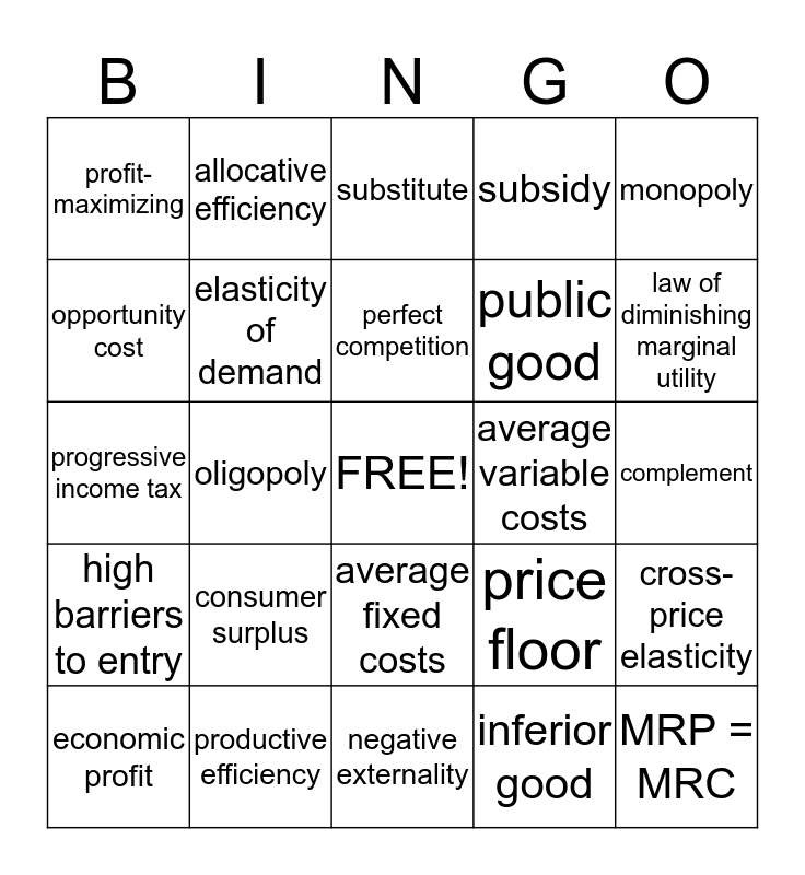 This bingo card has a free space and 24 words: consumer surplus, productive efficiency, perfect competition, economic profit, monopoly, profit-maximizing, opportunity cost, allocative efficiency, average variable costs, average fixed costs, public good, progressive income tax, price floor, cross-price elasticity, elasticity of demand, inferior good, complement, substitute, law of diminishing marginal utility, oligopoly, MRP = MRC, high barriers to entry, subsidy and negative externality.