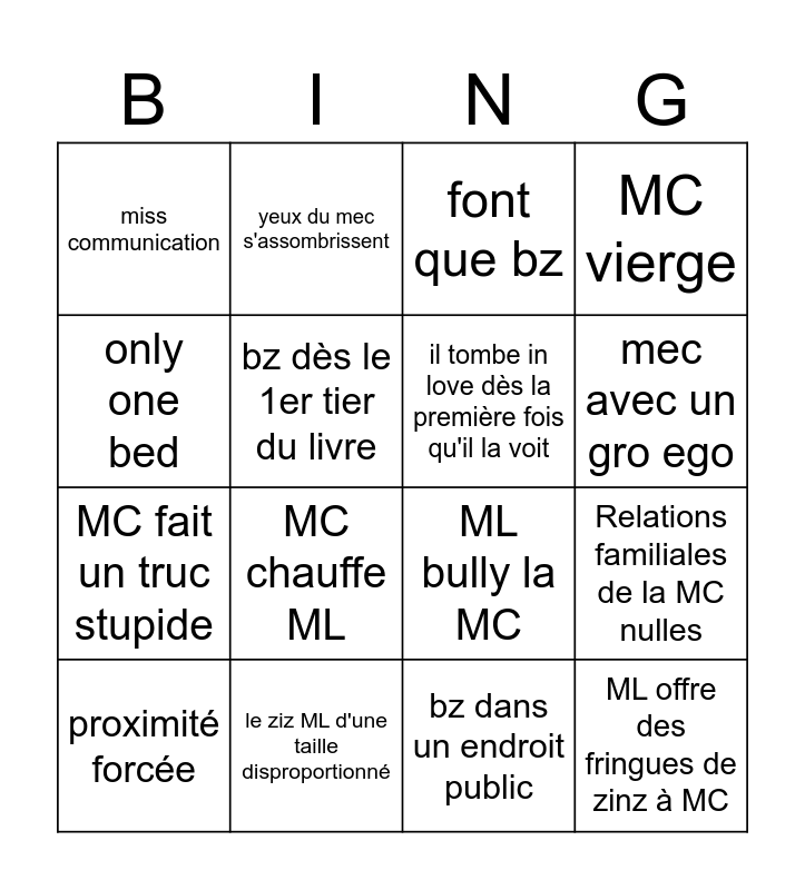 This bingo card has 16 words: le ziz ML d'une taille disproportionné, Relations familiales de la MC nulles, font que bz, miss communication, MC fait un truc stupide, yeux du mec s'assombrissent, ML bully la MC, bz dans un endroit public, only one bed, bz dès le 1er tier du livre, proximité forcée, MC vierge, MC chauffe ML, mec avec un gro ego, il tombe in love dès la première fois qu'il la voit and ML offre des fringues de zinz à MC.