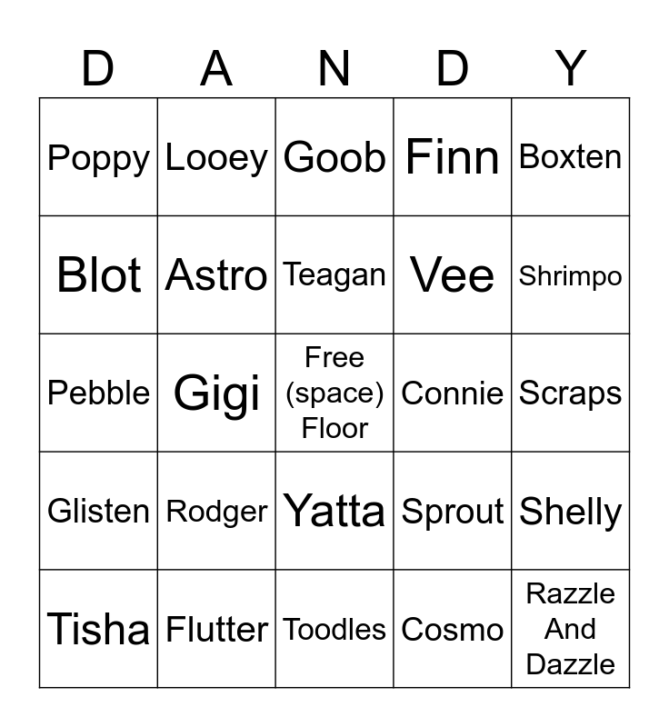 This bingo card has a free space and 25 words: Rodger, Toodles, Teagan, Tisha, Boxten, Poppy, Blot, Looey, Connie, Yatta, Vee, Pebble, Sprout, Shelly, Astro, Brightney, Scraps, Goob, Shrimpo, Gigi, Razzle And Dazzle, Flutter, Glisten, Finn and Cosmo.