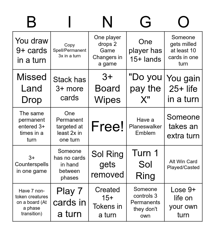 This bingo card has a free space and 36 words: $30+ card is played, Kev Walker Spotted, Universe Beyond Card, Stack has 3+ more cards, Turn 1 Sol Ring, 3+ Counterspells in one game, 3+ Board Wipes, Commander killed 3+ times, Someone gets milled at least 10 cards in one turn, Graveyard at least 20 cards, One Permanent targeted at least 2x in one turn, One player has 15+ lands, Emblem in play, Have a Planeswalker Emblem, You gain 25+ life in a turn, You draw 9+ cards in a turn, 20+ cards exiled in one go, Someone has no cards in hand between phases, Lose 9+ life on your own turn, One player drops 2 Game Changers in a game, Someone takes an extra turn, Alt Win Card Played/Casted, Play 7 cards in a turn, Have 7 non-token creatures on a board (At a phase transition), Created 15+ Tokens in a turn, Copy Spell/Permanent 3x in a turn, The same permanent entered 3+ times in a turn, Free Cast 4+ times in a turn, "Do you pay the X", Missed Land Drop, Someone didn't cast a spell during their own turn post turn 5, Having to discard for cleanup, Someone controls 3 Permanents they don't own, Sol Ring gets removed, Someone has 10+ Commander Damage from the same commander and A turn takes 7+ minutes.