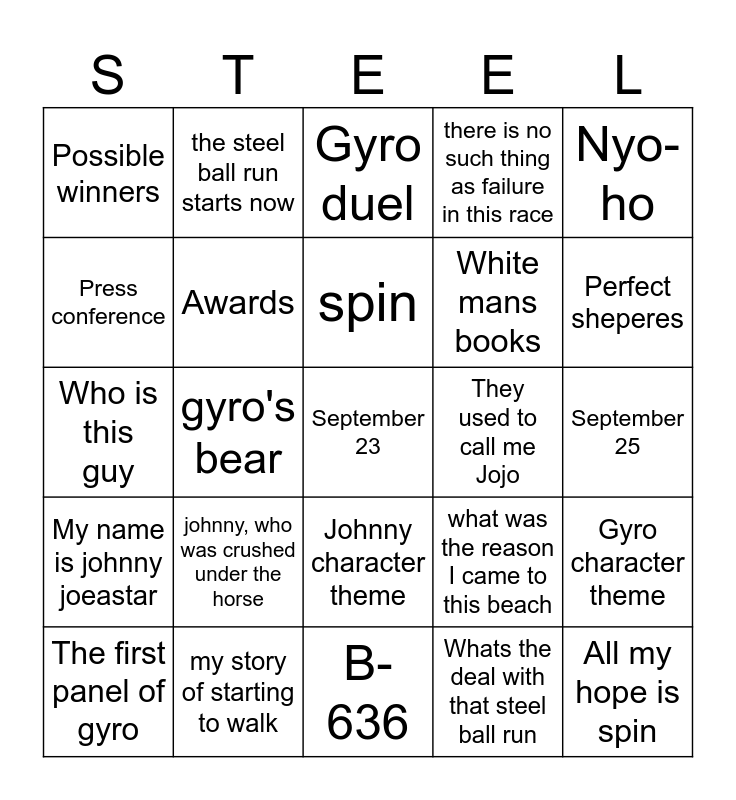 This bingo card has a free space and 24 words: johnny, who was crushed under the horse, my story of starting to walk, spin, The first panel of gyro, Nyo-ho, Possible winners, Press conference, the steel ball run starts now, They used to call me Jojo, Johnny character theme, White mans books, Who is this guy, what was the reason I came to this beach, Gyro character theme, Awards, Whats the deal with that steel ball run, September 25, Gyro duel, Perfect sheperes, gyro's bear, All my hope is spin, My name is johnny joeastar, there is no such thing as failure in this race and B-636.