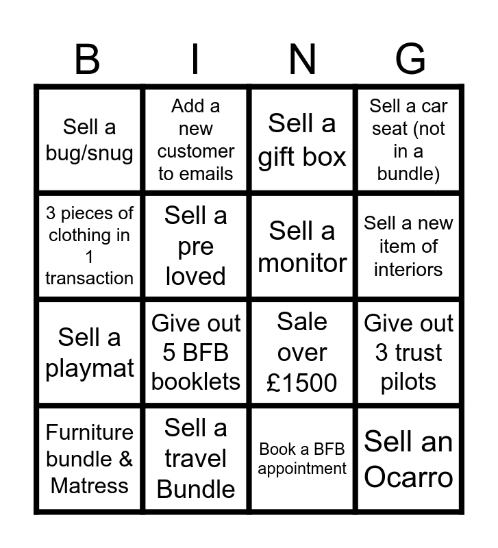 This bingo card has 16 words: Sell a travel Bundle, Give out 3 trust pilots, Sell a gift box, Sell a bug/snug, Sell a playmat, Add a new customer to emails, Sale over £1500, Book a BFB appointment, 3 pieces of clothing in 1 transaction, Sell a pre loved, Furniture bundle & Matress, Sell a car seat (not in a bundle), Give out 5 BFB booklets, Sell a new item of interiors, Sell a monitor and Sell an Ocarro.