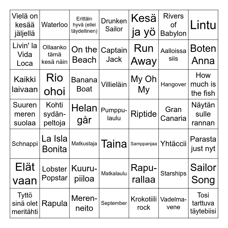 This bingo card has a free space and 48 words: Rapu-rallaa, Aalloissa siis, September, Kohti sydän-peltoja, Banana Boat, Näytän sulle rannan, Waterloo, Rapula, Rivers of Babylon, Taina, Lintu, Drunken Sailor, Hangover, My Oh My, Elät vaan, Gran Canaria, Livin' la Vida Loca, Boten Anna, Starships, Kesä ja yö, Run Away, Helan går, Vielä on kesää jäljellä, Ollaanko tämä kesä näin, Sailor Song, On the Beach, How much is the fish, Tyttö sinä olet meritähti, Villieläin, Rio ohoi, Vadelma-vene, Riptide, Parasta just nyt, Lobster Popstar, Suuren meren suolaa, Samppanjaa, Yhtäccii, Kaikki laivaan, Matkustaja, Kuuru-piiloa, Schnappi, Tosi tarttuva täytebiisi, Erittäin hyvä (ellei täydellinen), Meren-neito, Captain Jack, Matkalaulu, La Isla Bonita and Krokotiili rock.
