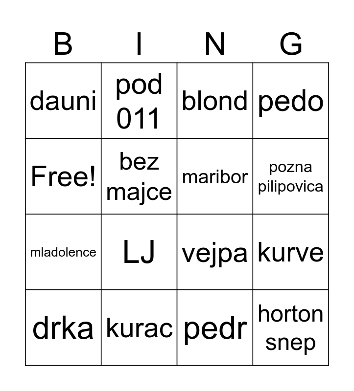 This bingo card has 16 words: kurac, kurve, blond, dauni, mladolence, pod 011, vejpa, pedr, Free!, bez majce, drka, pedo, LJ, pozna pilipovica, maribor and horton snep.