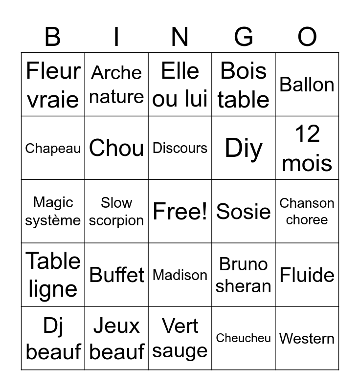 This bingo card has a free space and 24 words: Buffet, Jeux beauf, Discours, Dj beauf, Ballon, Fleur vraie, Chapeau, Arche nature, Sosie, Madison, Diy, Magic système, Bruno sheran, Fluide, Chou, Cheucheu, Chanson choree, Elle ou lui, 12 mois, Slow scorpion, Western, Table ligne, Bois table and Vert sauge.