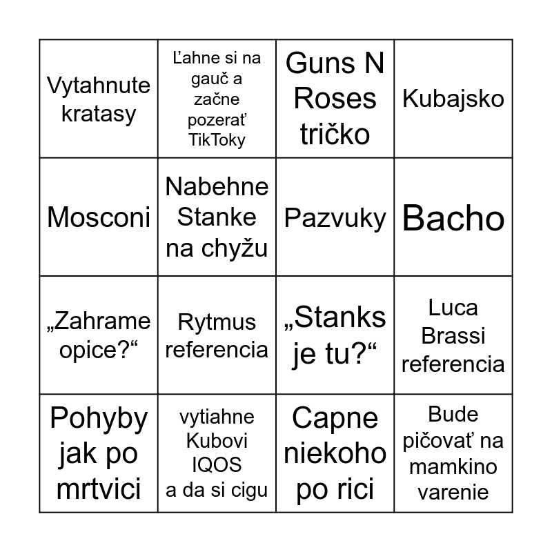This bingo card has 25 words: „Čo je dneska na večerku?“, Otvorí chladničku, Bacho, Janicious, Mosconi, Vytahnute kratasy, Nabehne Stanke na chyžu, Ľahne si na gauč a začne pozerať TikToky, vytiahne Kubovi IQOS a da si cigu, Ujebe Maťovi pollitrak, „Zahrame opice?“, „Stanks je tu?“, Bude mu vidno prdel do polky chrbta, Ujebe niekomu šlapky, Pazvuky, „A to platí Edo?“, Capne niekoho po rici, Guns N Roses tričko, Rytmus referencia, Luca Brassi referencia, Pohyby jak po mrtvici, Čipčaldinho, Bude pičovať na mamkino varenie, Kubajsko and Starý otec mention.