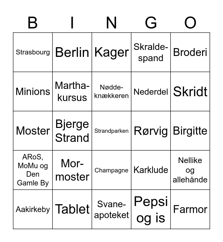 This bingo card has a free space and 29 words: Aakirkeby, Varm mælk med honning, Bjerge Strand, Syning, Strasbourg, Kager, Martha-kursus, Mor-moster, Rørvig, Tablet, Birgitte, Farmor, Svane-apoteket, Pepsi og is, Skridt, Berlin, Champagne, ARoS, MoMu og Den Gamle By, Broderi, Moster, Karklude, Kakerlakker, Nederdel, Minions, Skralde-spand, Berlin, Nellike og allehånde, Nødde-knækkeren and Rap i replikken.