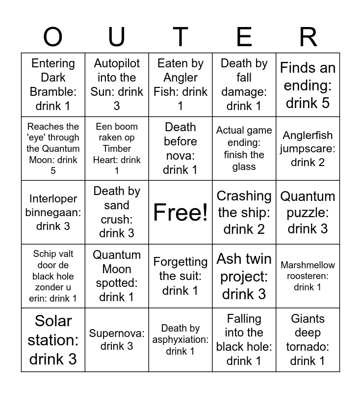 This bingo card has a free space and 24 words: Quantum Moon spotted: drink 1, Supernova: drink 3, Death before nova: drink 1, Solar station: drink 3, Finds an ending: drink 5, Entering Dark Bramble: drink 1, Reaches the 'eye' through the Quantum Moon: drink 5, Autopilot into the Sun: drink 3, Crashing the ship: drink 2, Forgetting the suit: drink 1, Actual game ending: finish the glass, Interloper binnegaan: drink 3, Ash twin project: drink 3, Marshmellow roosteren: drink 1, Een boom raken op Timber Heart: drink 1, Falling into the black hole: drink 1, Quantum puzzle: drink 3, Eaten by Angler Fish: drink 1, Anglerfish jumpscare: drink 2, Death by sand crush: drink 3, Giants deep tornado: drink 1, Schip valt door de black hole zonder u erin: drink 1, Death by fall damage: drink 1 and Death by asphyxiation: drink 1.
