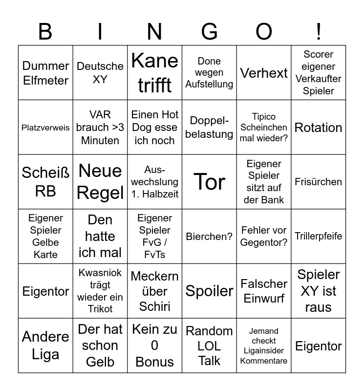 This bingo card has 36 words: Spoiler, Meckern über Schiri, Random LOL Talk, Platzverweis, Eigener Spieler Gelbe Karte, Tor, VAR brauch >3 Minuten, Kein zu 0 Bonus, Verhext, Falscher Einwurf, Rotation, Done wegen Aufstellung, Spieler XY ist raus, Neue Regel, Doppel-belastung, Dummer Elfmeter, Eigentor, Eigener Spieler sitzt auf der Bank, Scheiß RB, Kane trifft, Aus-wechslung 1. Halbzeit, Den hatte ich mal, Bierchen?, Eigener Spieler FvG / FvTs, Fehler vor Gegentor?, Deutsche XY, Tipico Scheinchen mal wieder?, Der hat schon Gelb, Einen Hot Dog esse ich noch, Scorer eigener Verkaufter Spieler, Eigentor, Andere Liga, Trillerpfeife, Frisürchen, Kwasniok trägt wieder ein Trikot and Jemand checkt Ligainsider Kommentare.