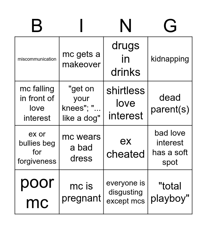 This bingo card has 44 words: CURSED, poor mc, virgin mc, evil ex, secretly rich love interest, mean bully rival, drugs in drinks, poor cgi wolves, mc falling in front of love interest, love interest saves mc and gets hurt, kidnapping, mc is pregnant, mc is a long lost daughter of a rich family, love at first sight, mean guys make fun of mc until they find out she's rich, mc is still bullied mid movie, contractual marriage, ex cheated, mc has one good girl friend, mc wears a bad dress, mc gets a makeover, love interest is clearly way better than evil ex, mc doesn't stand up for herself, miscommunication, sold into marriage by evil relative/boyfriend, everyone is disgusting except mcs, official event (party/auction), short wedding dress, love interest is a red flag, "total playboy", wacky names, cheek slap, emotional constipation, hostage situation, bad love interest has a soft spot, relative in a hospital, anger issues, someone dies, dead parent(s), "get on your knees"; "... like a dog", ex or bullies beg for forgiveness, ex or bullies get what they deserve, shirtless love interest and best friend betrays mc.