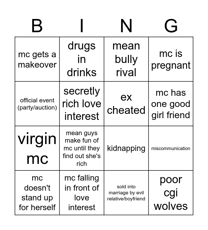 This bingo card has 28 words: CURSED, poor mc, virgin mc, evil ex, secretly rich love interest, mean bully rival, drugs in drinks, poor cgi wolves, mc falling in front of love interest, love interest saves mc and gets hurt, kidnapping, mc is pregnant, mc is a long lost daughter of a rich family, love at first sight, mean guys make fun of mc until they find out she's rich, mc is still bullied mid movie, contractual marriage, ex cheated, mc has one good girl friend, mc wears a bad dress, mc gets a makeover, love interest is clearly way better than evil ex, mc doesn't stand up for herself, miscommunication, sold into marriage by evil relative/boyfriend, everyone is disgusting except mcs, official event (party/auction) and short wedding dress.