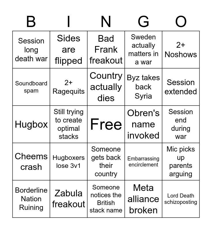 This bingo card has a free space and 34 words: Peace out starting war instantly, Meta alliance broken, Gape, Someone loses to Cheems, Cheems crash, 2+ Ragequits, 2+ Noshows, Borderline Nation Ruining, Sides are flipped, Bart failhosts, Country actually dies, Bad Frank freakout, Noshow shows up, Playerless Major power, Obren's name invoked, Session extended, Zabula freakout, Hugbox, Hugboxers lose 3v1, Embarrassing encirclement, Someone gets back their country, Zabula gets Lechia again, Session long death war, Session end during war, Someone notices the British stack name, Lord Death schizoposting, Sweden actually matters in a war, World war over Balkans, Byz takes back Syria, Soundboard spam, Player doesn't fight any other player, Still trying to create optimal stacks, Mic picks up parents arguing and Copium overdose.