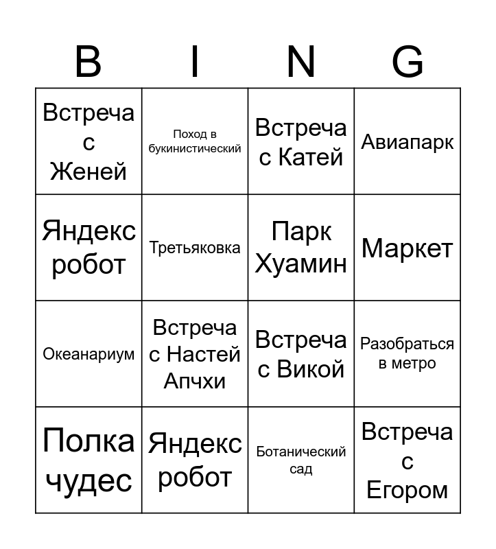 This bingo card has 18 words: Встреча с Настей Апчхи, Встреча с Егором, Встреча с Катей, Встреча с Женей, Встреча с Викой, Авиапарк, Полка чудес, Поход в букинистический, Маркет, Океанариум, Ботанический сад, Яндекс робот, Разобраться в метро, Третьяковка, Парк Хуамин, Скетч батлл, Яндекс робот and Красная площадь.